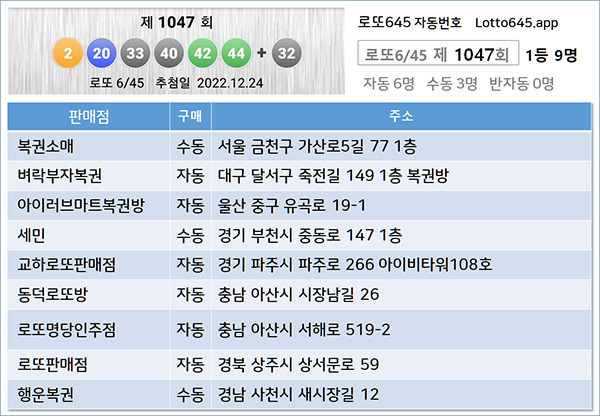 오늘 로또 1등 당첨번호 2 20 33 40 42 44번 보너스 번호 32번 당첨. 1048회 로또 번호 조합 최다 당첨 연속 홀짝수 당첨 색상 로또분석 당첨번호. Web 로또당첨번호 로또당첨번호 로또 1048회 추첨일20221224 로또1047회 당첨번호.